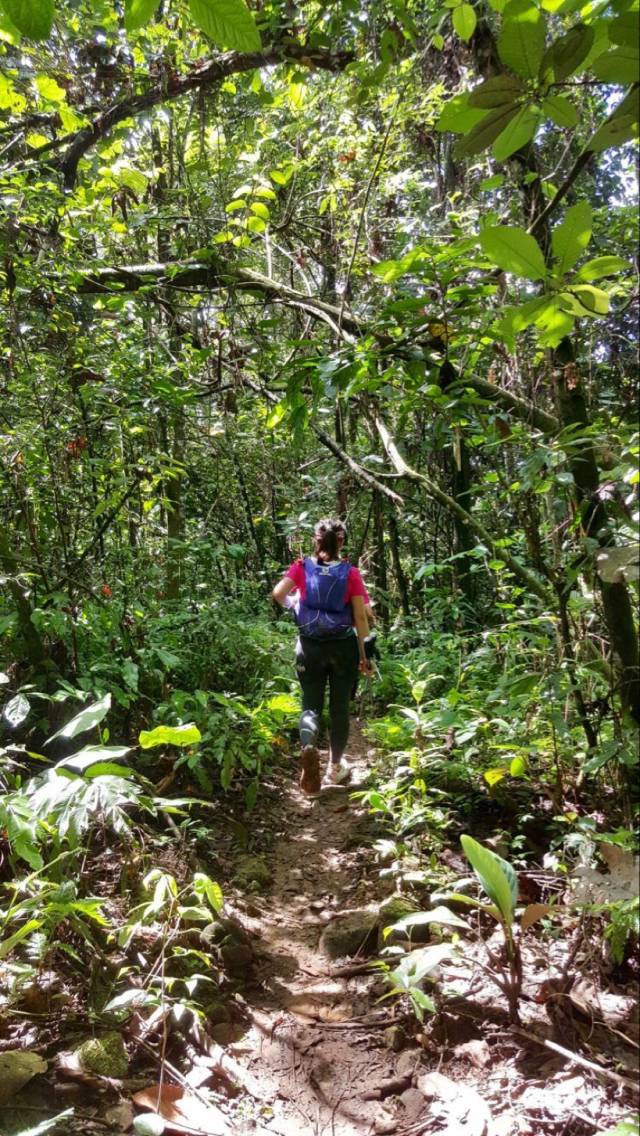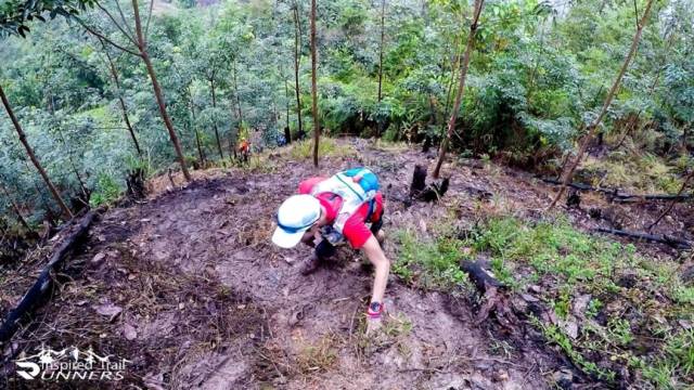 WS1补好水,离开公路进入土路,进入传说中的原始热带雨林,树木和蕨类没有既往选手写的赛记描述的惊人的巨大(可能我们也来自广州,山里也有类似植物)。这段土路由于之前下过雨略显湿滑,再加上许多选手超车,显得拥挤不堪。山间密林土路爬升不多久就开始一路下山,Bono等仨人又超越了我们仨。前面几百名选手踩过的下山土路更滑了,大家小心翼翼,经验丰富的Bono叔在此扑街并摔断了一根登山杖。
