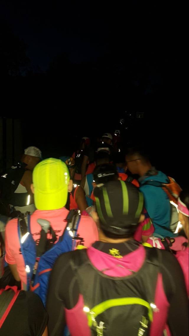 身体没有任何不适,心想宝丁推荐的肌鲣强真给力。在满是大小石头的机耕路我利用双杖暴走爬坡,超越了好多人,在某个时间当我突然回头看时,我发现前后大老远都没有任何灯光,莫名其妙开始恐惧,越害怕就是想到道听途说来的的各种关于神山的邪门鬼故事,加上机耕路两旁的各种树枝影影绰绰、水管吱吱喷水、各种动物啾啾作响,惊恐的在机耕路上狂奔。当然如果一直是在机耕路这样走下去,也还可以接受,但走着走着路变窄了,只有一人宽,又开始土路往上爬,我的恐惧感彻底加倍,我不敢一个人走了!于是找了一块石头坐下来,必须等到有人来我才敢继续。等的时候发现磨裆了,会阴部剧痛(此时太后悔没有穿小鱼儿推荐的迪卡侬防磨内裤,但晚了),于是黑灯瞎火脱了压缩裤真空上阵。漫长的等待,终于来了三个马来仔,简单打招呼后我跟在了他们屁股后面。又是连串的村庄土路爬升、路过村庄狗叫的很凶,我想要是这时候要是有本地人打劫,我一定最快速度所有财物都交给他,没任何力气反抗,还好这只是被害妄想,村庄的马来人见到选手都很nice打招呼。
