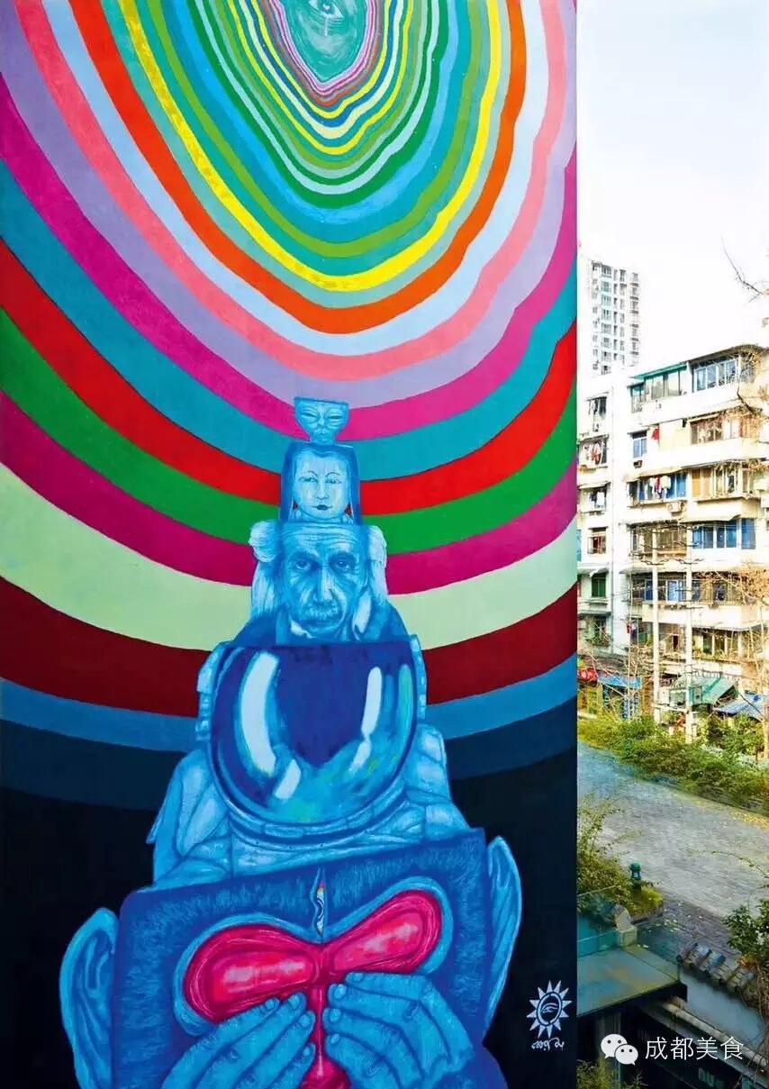 其中一面墙,画有4层楼高的涂鸦画。他就是在这幅画的对面租下三层楼,开了家餐厅,卖火锅烤鱼小龙虾。