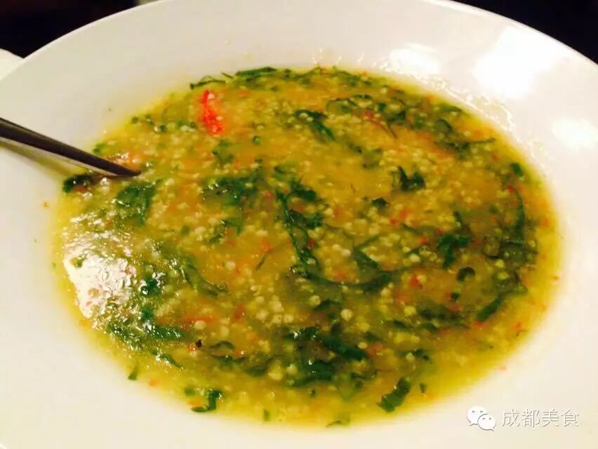这道菜是老板的创新菜,表面看起平淡无奇,但是一勺子下去才发现另有乾坤,暗藏了不少红彤彤的虾钳。甜甜的小米粥,还加入了红椒碎末,青菜碎末。甜中带点微咸,不管是饭前来一碗暖胃还是吃过辣后来一碗消辣都是极好的。