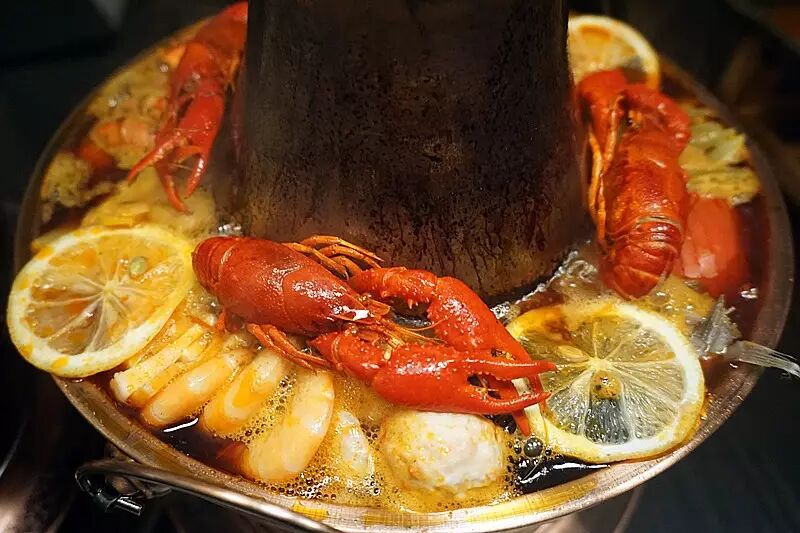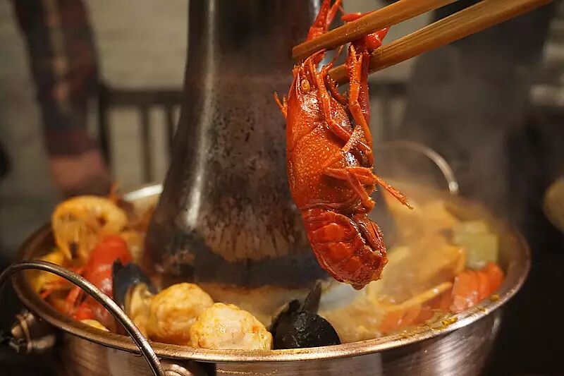 韩式鲜虾铜火锅 冬天到了吃小龙虾的人少了,老板特意从韩国考察回来研制了这款加了小龙虾的铜火锅,合理的把明洞的火锅和我们这边的铜锅结合到了一起,加入了四川独有的香料,口感上甜辣融合。