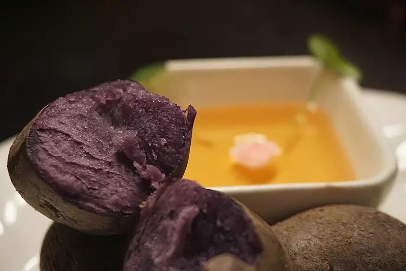 一顿大餐的最后回归最平淡朴实的味道。紫土豆,没错,不是紫薯,是紫土豆。这种特别的品质来自阿坝,在当地有着黑美人的美誉,含花青素,美容养颜抗衰老。从外表到内心都是紫色的,配上蜂蜜一起,又甜又糯,比紫薯好吃了几个档去咯!