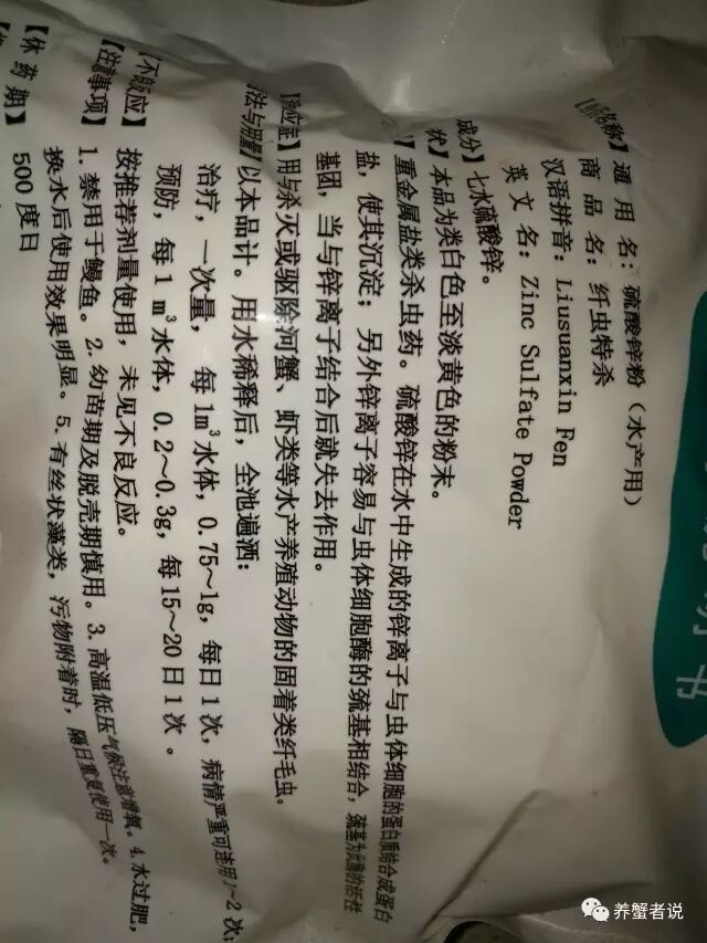 对于杀纤毛虫来讲,硫酸锌属重金属盐类杀虫药,其在水中生成的锌离子与虫体细胞的蛋白质结合成蛋白盐,使其沉淀;另外锌离子容易与虫体细胞酶的巯基相结合,巯基为此酶的活性基因,当与锌离子结合后就失去了作用,从而达到杀灭的目的。用于防治河蟹、虾类等水产养殖动物的固着类纤毛虫病。另外硫酸锌中含有多种矿质元素,在水体中能有效调节虾蟹细胞内外渗透压,能有效抑制虾蟹在水体盐度聚降时的应激反应,同时还可起到表皮收敛的作用,使虾蟹体表清晰,从而提高商品上市率。