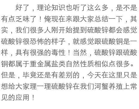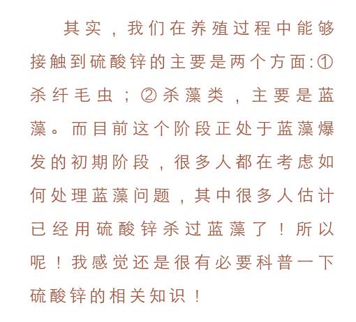 ②这两年蓝藻问题高发,很多人感觉蓝藻药太贵,所以选择饲料厂的硫酸锌粉,这种硫酸锌粉为一水硫酸锌,平常使用4两、5两都能够立马把所有藻类杀掉,包括这其中的蓝藻!一水硫酸锌不建议多用,因为它对伊乐藻有一定的伤害作用!