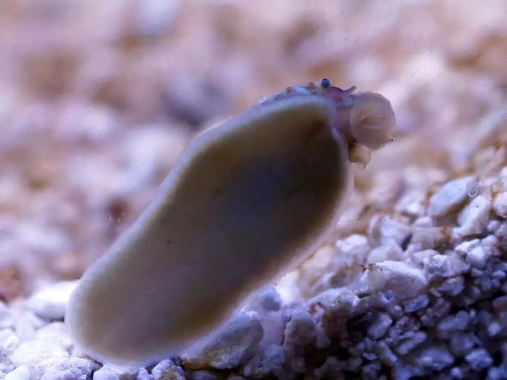 描述:琵琶螺更像是海蛞蝓和海螺的综合体,但是背壳又非常扁平和不起眼。他们身上一般都是斑驳的棕绿色,有时候也有灰黑和其它颜色,毕竟琵琶螺是种统称,所以也有些偏差也很正常,一般来说它们不会超过2cm,晚上可以拿个手电筒,还是很容易发现它们的!
